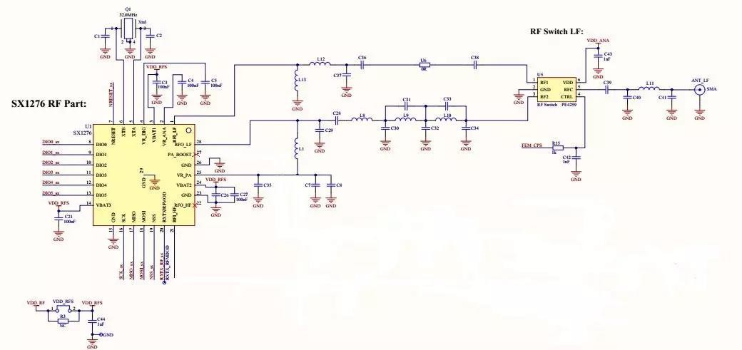 Note: According to the data sheet of SX1278, it can be seen that the power from the 27th pin PA_BOOST pin can reach 20dBm during transmission, but the power consumption is low when transmitting, and the current is about 120mA. The RFO_HF pin comes out, the power can reach 14dBm, and the current can be as low as 29mA, which is suitable for application scenarios with low power consumption requirements. Here mainly introduces the hardware design scheme of low power consumption. The circuit is divided into two parts: the design of the schematic diagram and the design of the PCB.